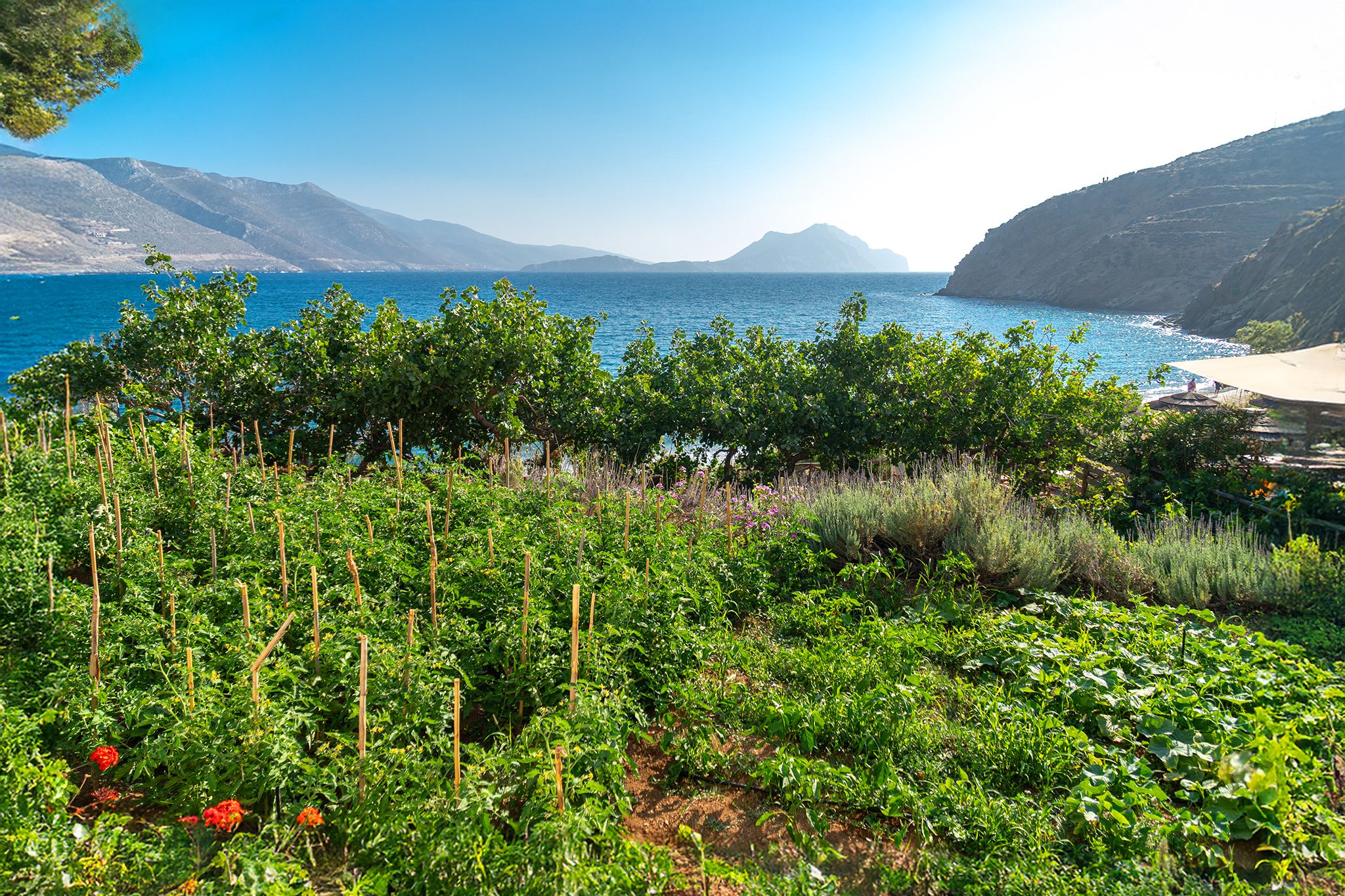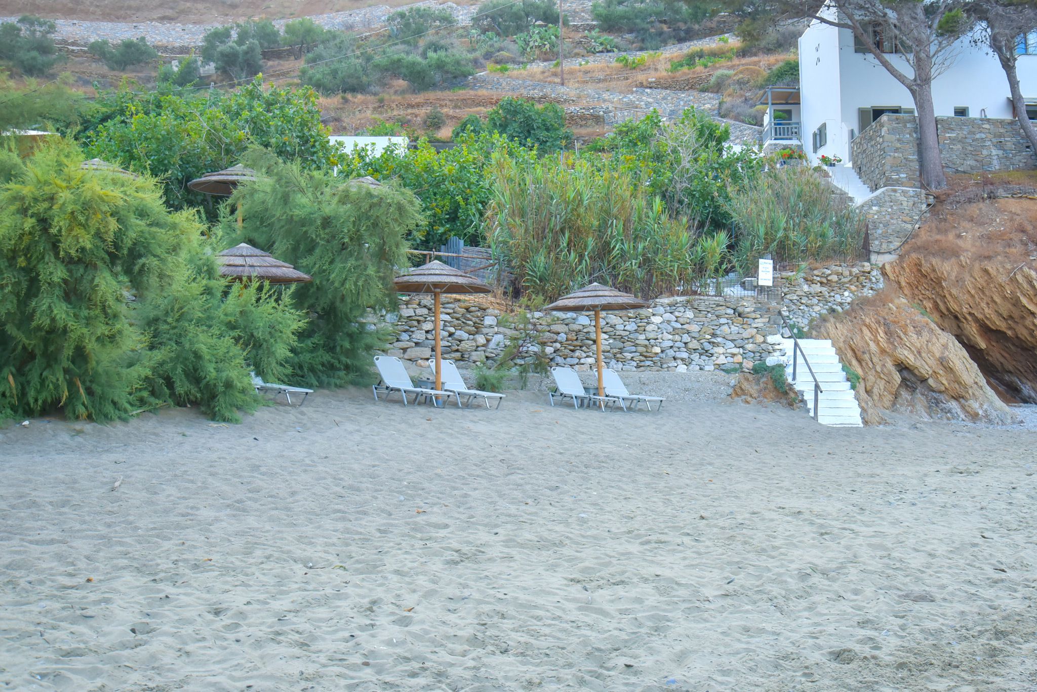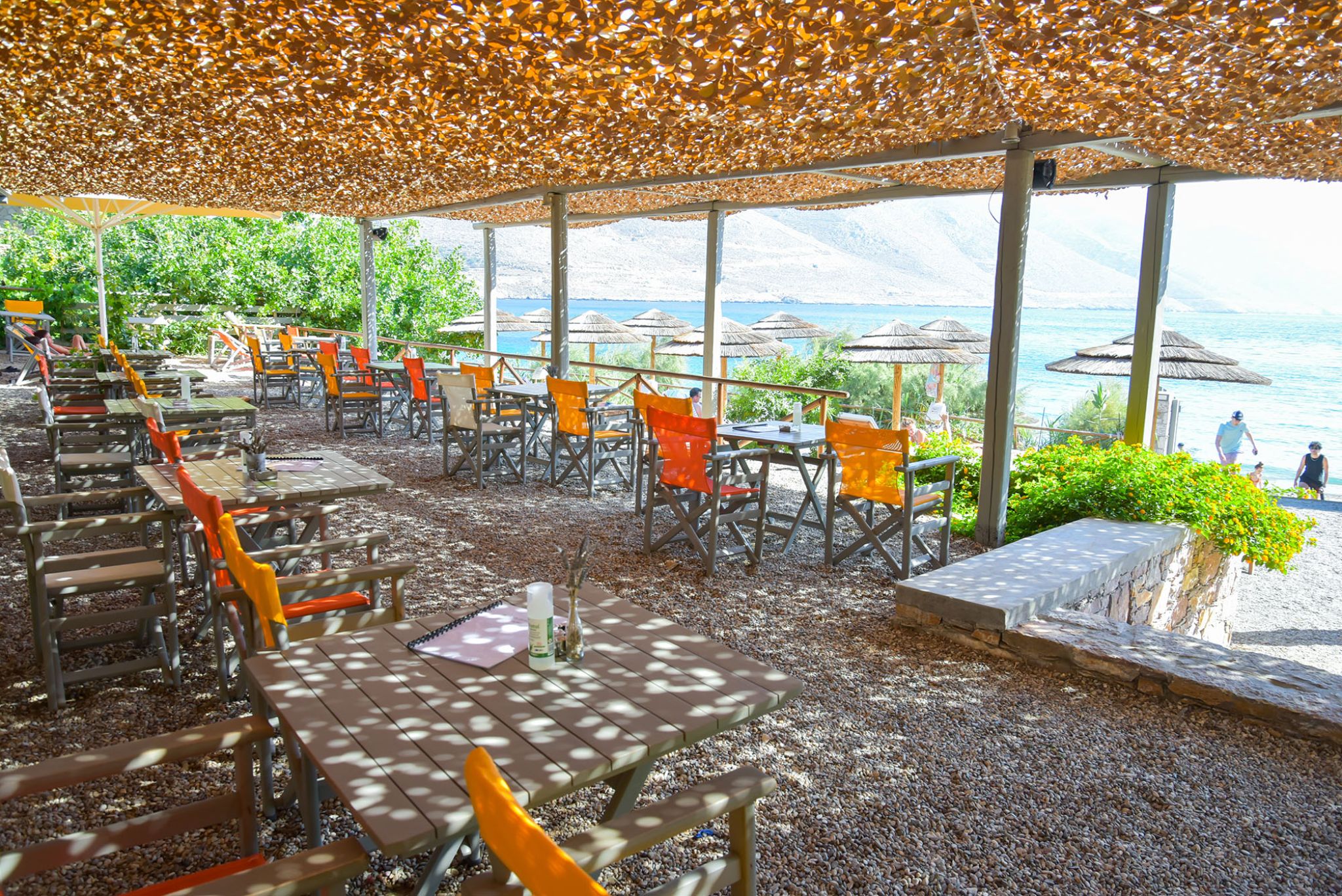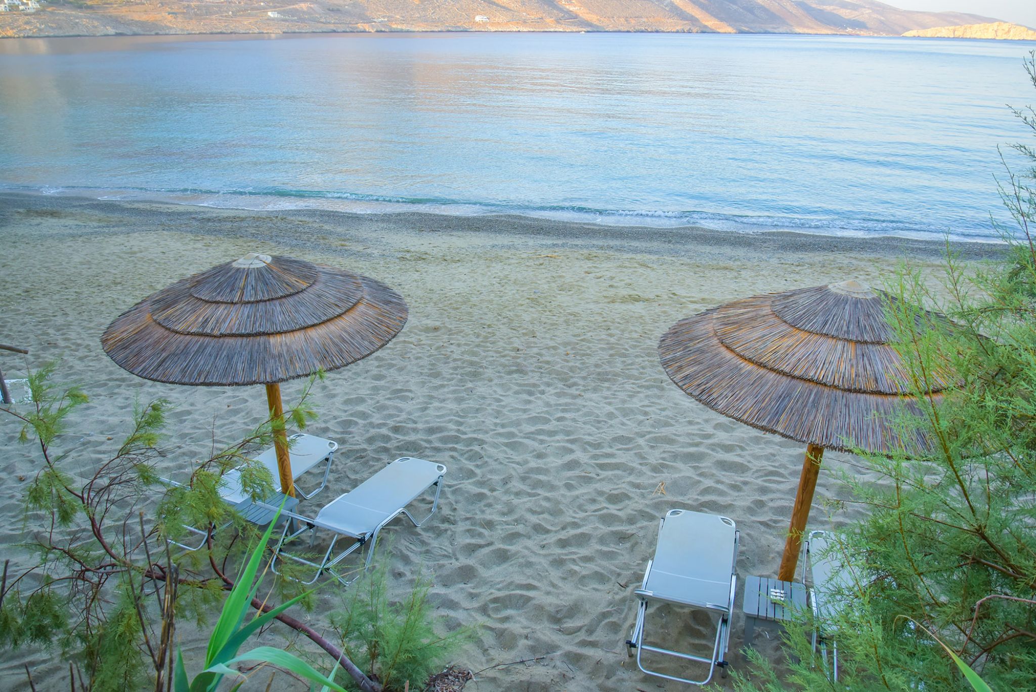 Petradi Beach Bar is wonderfully discovered right on Levrossos beach, on the north side of Amorgos, just 2 km from the port of Aigiali. This unrivaled seaside landscape is an unbeatable marriage of azure waters, fine sand, and beautiful tamarisks, creating a colorful heaven of nature. With a Cycladically lovely view of the surrounding mountains and the infinite sea, Levrossos beach offers a pure sense of tranquility.